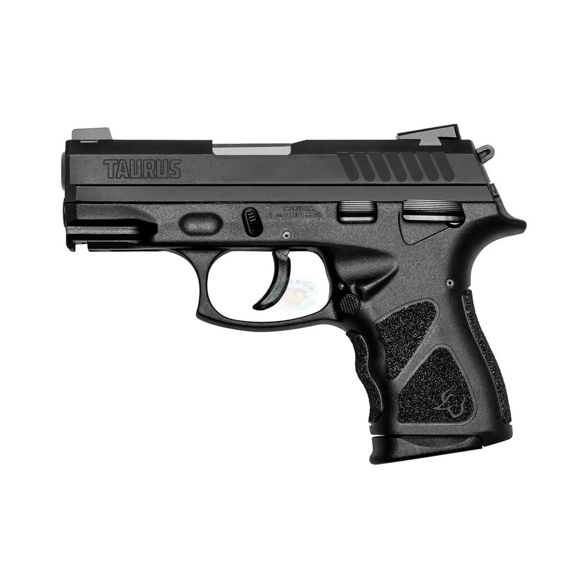 A Taurus TH40C é a versão compacta da renomada linha de pistolas TH da Taurus, projetada especificamente para o uso discreto e defesa pessoal sem abrir mão da robustez e do poder de parada do calibre .40 S&W. Equipada com sistema de percussão por cão externo e mecanismo de disparo em ação simples e dupla (SA/DA), a TH40C oferece ao usuário a confiabilidade de uma plataforma testada em campo, com dimensões reduzidas que facilitam o porte velado. Construída com armação em polímero de alta resistência e ferrolho com acabamento Tenox (teniferizado), a arma apresenta excelente durabilidade e resistência à corrosão. Sua ergonomia é reforçada por reténs ambidestros e trilho Picatinny (MIL-STD-1913) para acoplamento de acessórios. O modelo se destaca pela versatilidade de capacidade, acompanhando carregadores que permitem tanto o uso mais compacto quanto o uso com maior autonomia através de prolongadores de empunhadura.